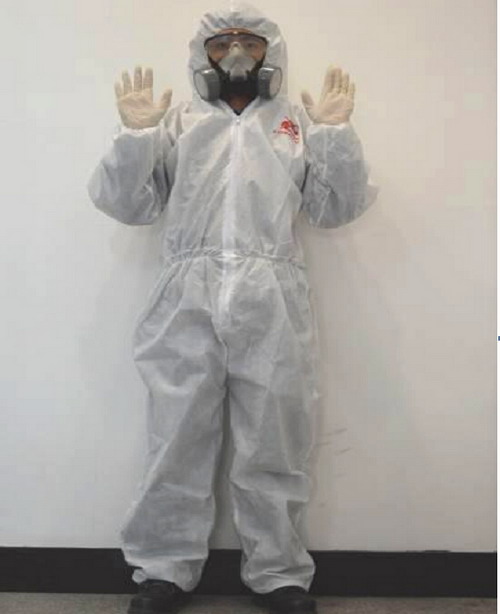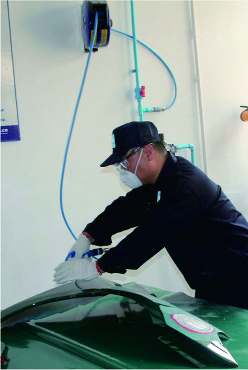 刮涂原子灰過(guò)程中,由于有毒溶劑的揮發(fā),為保護(hù)施工人員的人身安全,施工人員必須穿噴漆服、護(hù)目眼鏡、防毒面罩、無(wú)硅乳膠手套、防溶劑手套、工作鞋等。如圖2-30所示