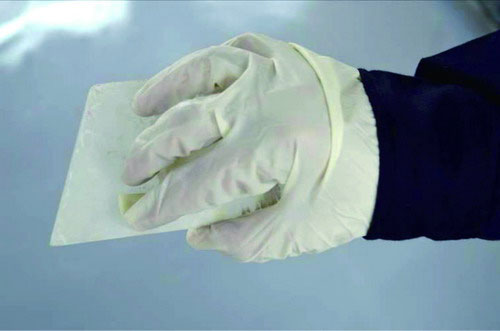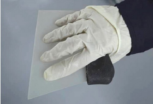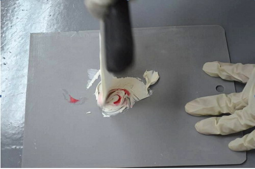 (7)如此重復(fù)地拌和,在這過(guò)程中注意觀察混合物顏色的均勻程度,直到原子灰充分拌和。如圖2-39所示。