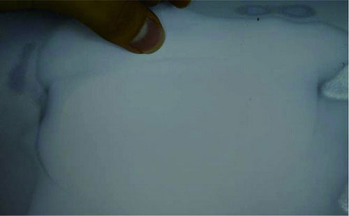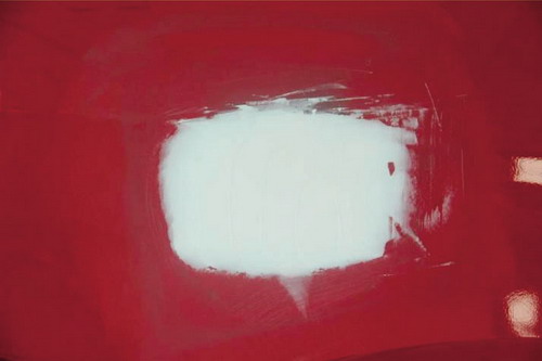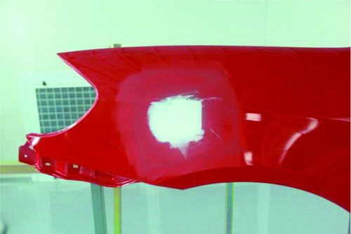 ②指刮法。在原子灰干燥過(guò)程中,可以用手指甲輕輕地刮原子灰邊緣薄的部分,檢查原子灰是否已經(jīng)干透。如果沒(méi)有干透,則在指甲上會(huì)粘有原子灰;如果已經(jīng)干透,則指甲不會(huì)粘上原子灰,并在原子灰上出現(xiàn)堅(jiān)硬的白色痕跡。如圖2-53所示。