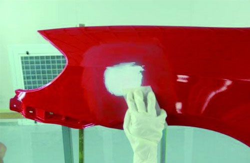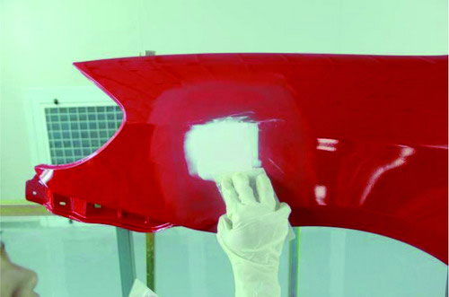 在進(jìn)行原子灰刮涂之前,應(yīng)先對(duì)已經(jīng)刷涂好的底漆部分進(jìn)行必要的打磨及清潔。先使用菜瓜布對(duì)底漆部分進(jìn)行輕微打磨,可以去掉底漆多余的那部分漆粉。再用吹塵槍進(jìn)行除塵清潔,避免刮涂后的原子灰與底漆結(jié)合不牢固。如圖2-31所示。