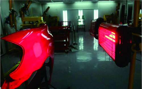 ②紅外線干燥。如果環(huán)境溫度太低或者空氣濕度太大,原子灰干燥固化速度就會(huì)減慢。為了縮短原子灰的干燥時(shí)間,可以借用干燥器或者是紅外線烤燈加熱原子灰進(jìn)行干燥。一般烘烤時(shí)間設(shè)定為10min左右,在烘烤過(guò)程中,要不斷檢測(cè)板件的溫度,并檢查原子灰是否已經(jīng)干燥。如圖2-51所示。