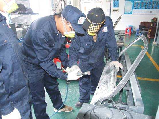 老師們使用鈑金工具套裝進行修復(fù)車身的練習(xí)