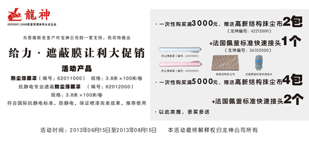 一次性購(gòu)買(mǎi)滿(mǎn)3000元,贈(zèng)送高新結(jié)構(gòu)抺塵布(龍神編號(hào):62212000)2包+法國(guó)佩釜標(biāo)準(zhǔn)快速接頭(龍神編號(hào):36102000)1個(gè)