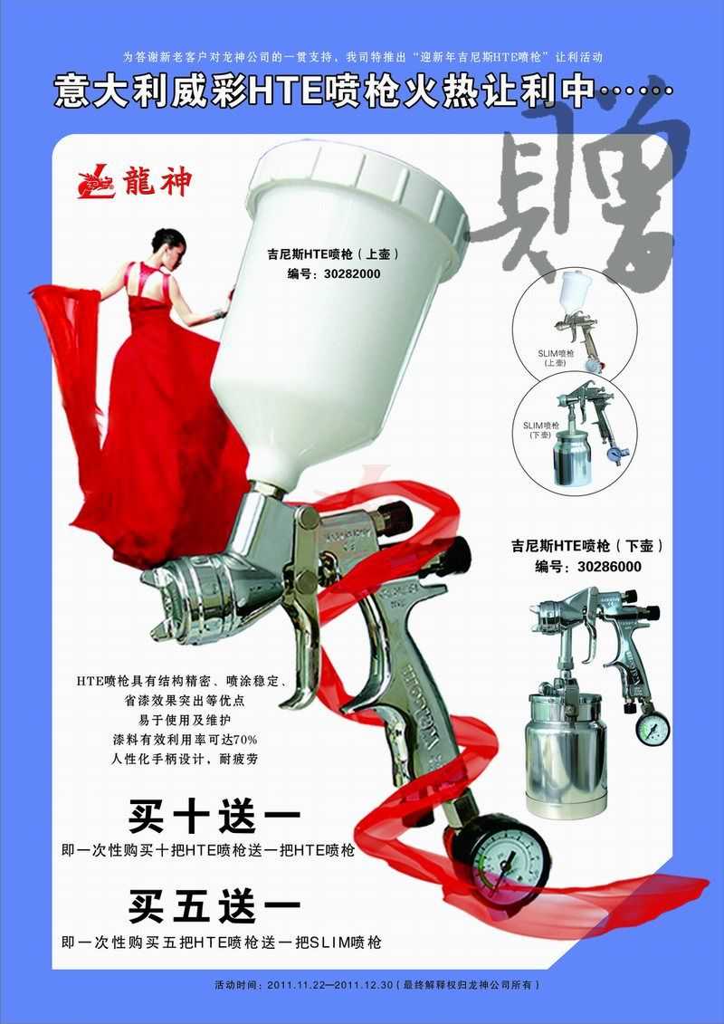吉尼斯HTE噴槍11月促銷 吉尼斯HTE噴槍2011年11月促銷 (活動已結(jié)束,感謝您的關(guān)注) 一、主題: 吉尼斯HTE噴槍讓利促銷 二、活動目的: 讓利回饋給力促銷 三、活動時間: 1、 時間:2011年11月21日至2011年12月30日 2、 時長:共計40天 四、活動內(nèi)容: 1、 買十送一(即一次購買十把HTE噴槍送一把HTE噴槍) 2、 買五送一(即一次購買五把HTE噴槍送一把SLIM噴槍) 市場部 2011年11月17日 宣傳海報 2011-11-19 12545