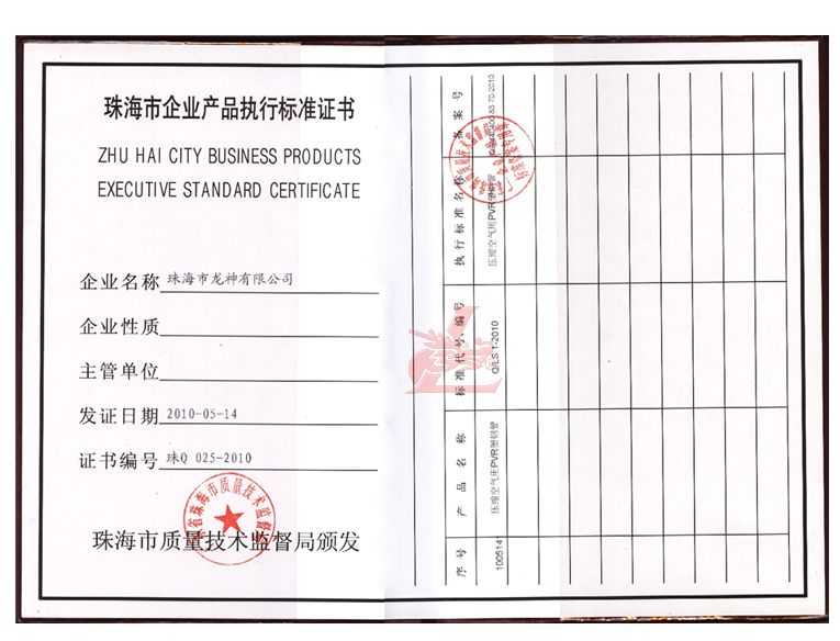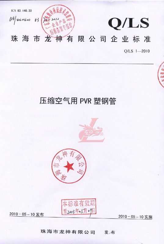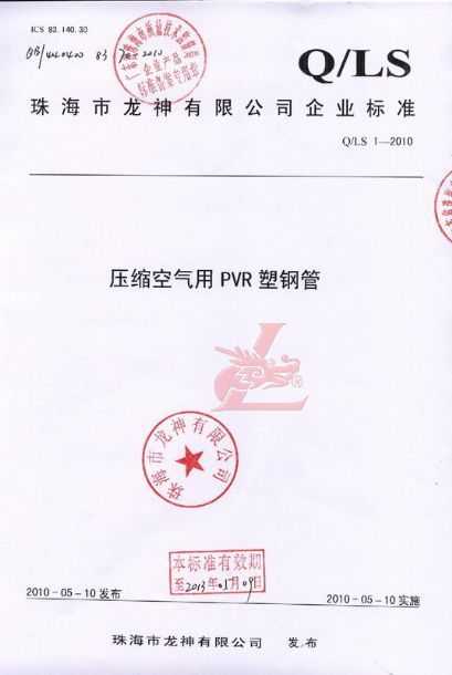 龍神壓縮空氣PVR塑鋼管成功申請(qǐng)企業(yè)執(zhí)行標(biāo)準(zhǔn) 2010年5月珠海市龍神有限公司“壓縮空氣PVR塑鋼管”得到珠海市質(zhì)量技術(shù)監(jiān)督局認(rèn)可,特此頒發(fā)“壓縮空氣PVR塑鋼管企業(yè)執(zhí)行標(biāo)準(zhǔn)”,龍神公司在嚴(yán)格執(zhí)行標(biāo)準(zhǔn)下,保證產(chǎn)品質(zhì)量。 2010-05-20 9626