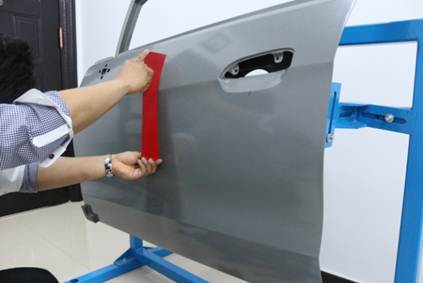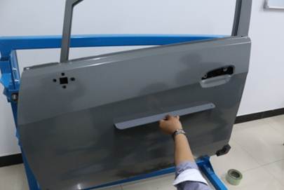 在40分鐘內(nèi),對(duì)雪佛蘭新賽歐左前門外板上的長(zhǎng)80mm,寬40mm,深10mm的條形凹陷(漆膜已破壞)進(jìn)行修復(fù),凹陷損傷穿過(guò)車身線。