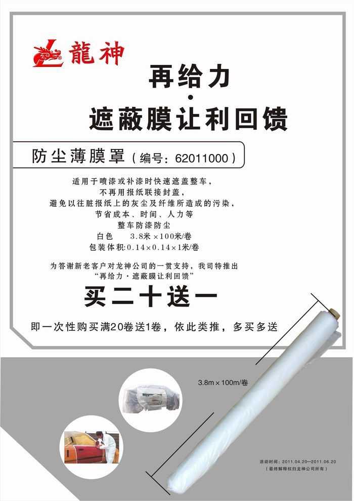 2011年4月再給力·遮蔽膜讓利回饋促銷! 2011年4月再給力·遮蔽膜讓利回饋促銷! (活動已結(jié)束,感謝您的關(guān)注) 一、活動主題: “再給力,遮蔽膜讓利回饋” 二、活動時間: 1、時間:2011年04月20日至2011年06月20日 2、時長:共計2個月 三、促銷產(chǎn)品: 防塵薄膜罩 尺寸3.8米*100米/卷 龍神編號:62011000 買20送1 ,一次性購買滿20卷送1卷,如此類推,多買多送。 2011-04-19 12037