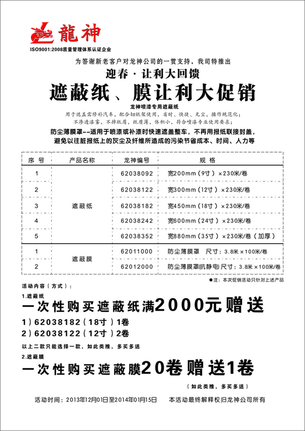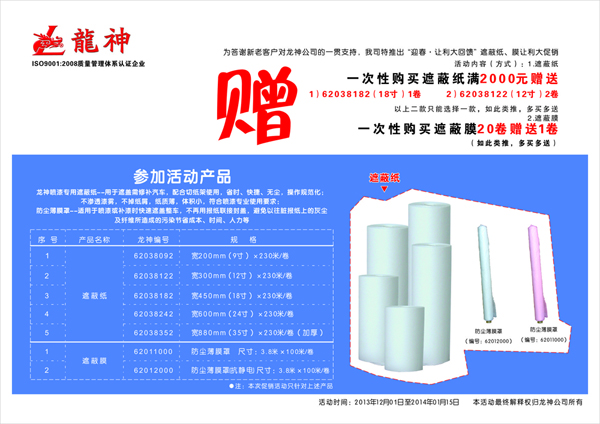 一次性買滿遮蔽膜20卷贈送1卷。如此類推,多買多送。