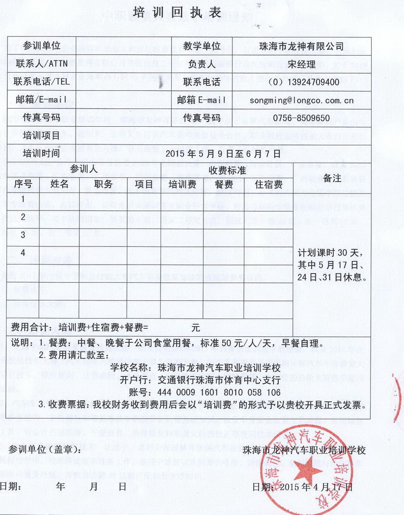 培訓(xùn)時(shí)間30天,即從2015年5月9日起至6月7日止,其中5月17日、24日31日休息;期間餐費(fèi)按照上課時(shí)間27天預(yù)收,實(shí)際參照離開(kāi)時(shí)間調(diào)整。具體收費(fèi)情況請(qǐng)來(lái)電咨詢。